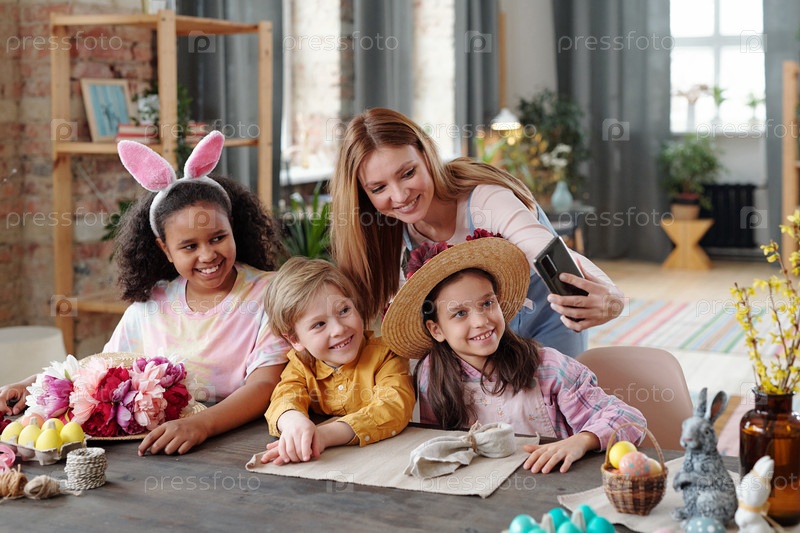Женщина делает селфи с детьми