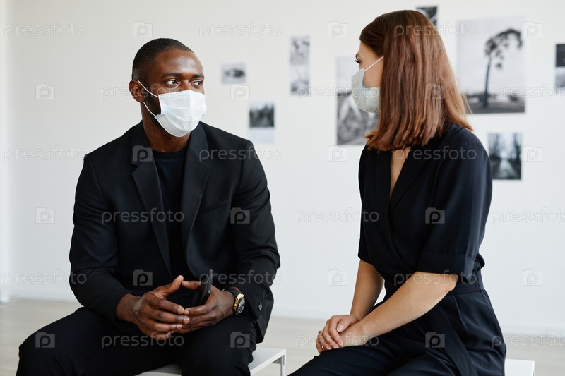 Смешанная раса пара, носящая маски в художественной галерее