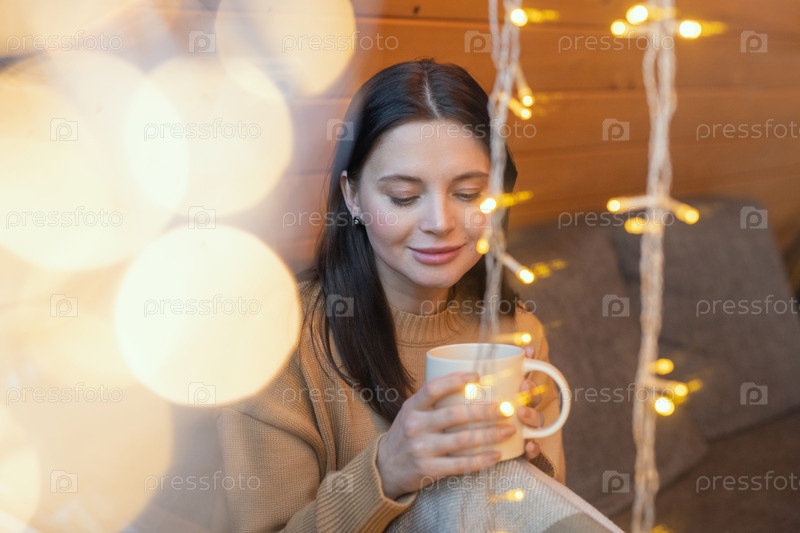 Молодая спокойная брюнетка с кружкой горячего чая сидит на диване у окна