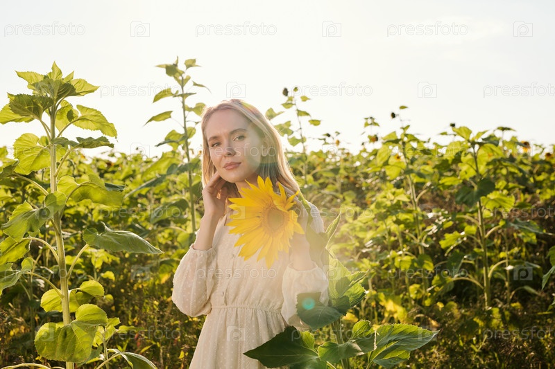Красивая молодая блондинка в деревенском платье стоит перед камерой