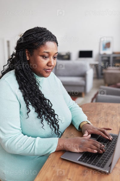 Афроамериканская женщина с избыточным весом, использующая компьютер дома
