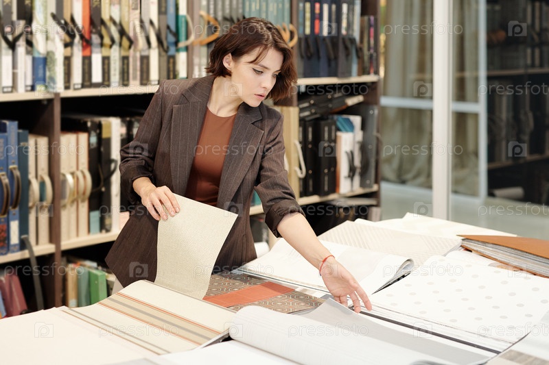 Молодая руководительница студии дизайна интерьера смотрит на образцы