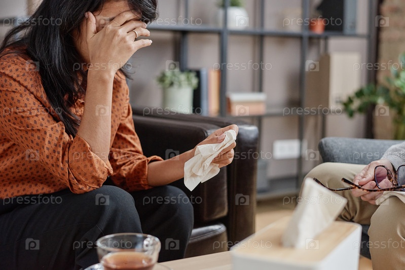 Горизонтальный снимок неузнаваемой молодой взрослой женщины, страдающей депрессией и проходящей сеанс психотерапии