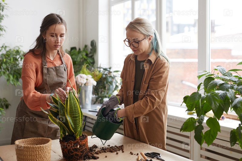 Две молодые женщины кладут цветы в магазин