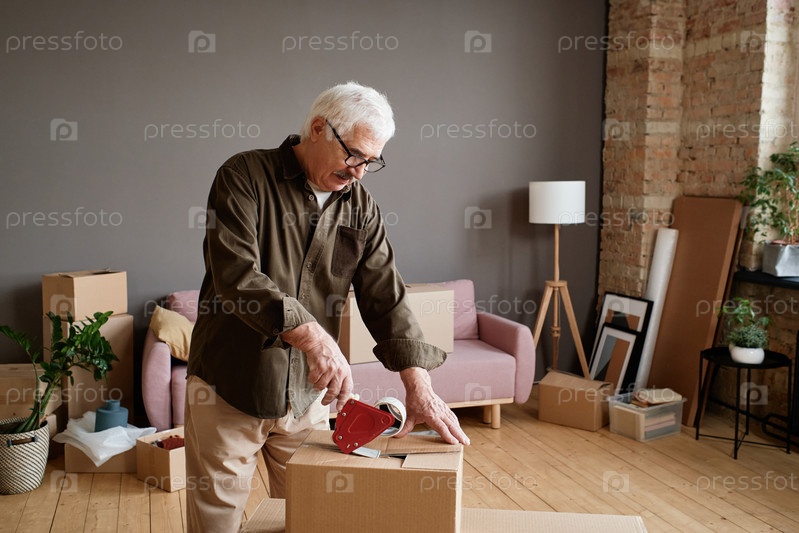 Горизонтальный средний снимок зрелого мужчины, готовящегося к переезду в новый дом, упаковывающий вещи в коробки и записывая их