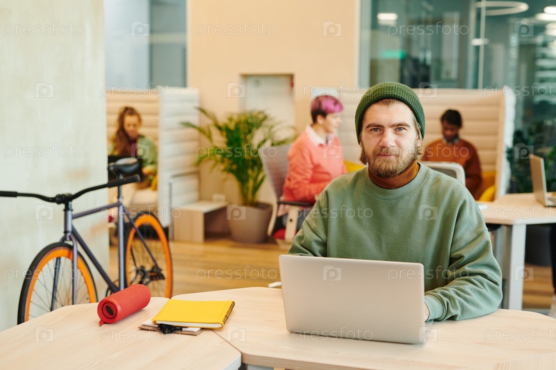 Бородатый мужской офисный менеджер в непринужденной одежде использует ноутбук против коллег