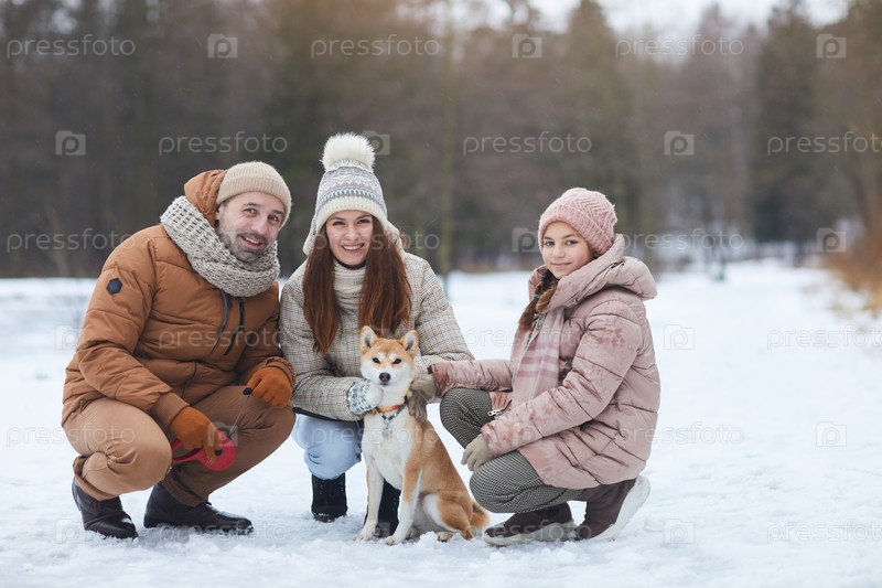 Семья гуляет с собакой зимой Happy