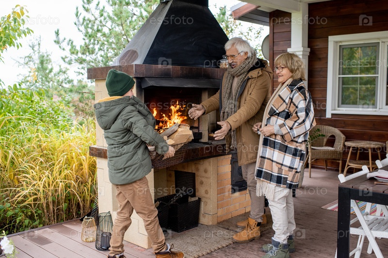 Счастливая старшая пара в теплом повседневной одежде стоит у камина загородного дома