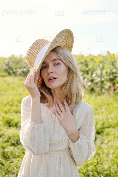 Красивая молодая блондинка в соломенной шляпе и белом деревенском платье