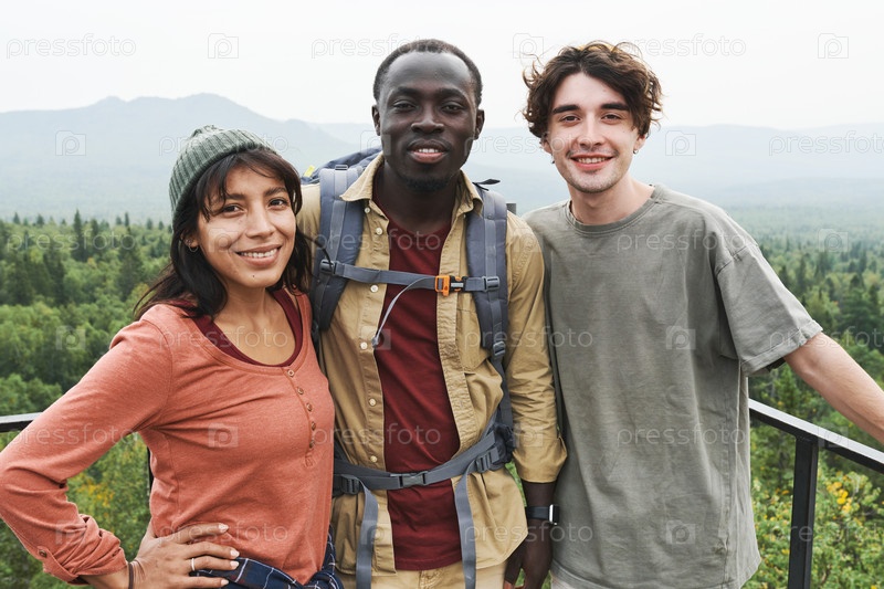Портрет позитивных молодых мультиэтнических друзей, стоящих на мосту против красивого лесного пейзажа