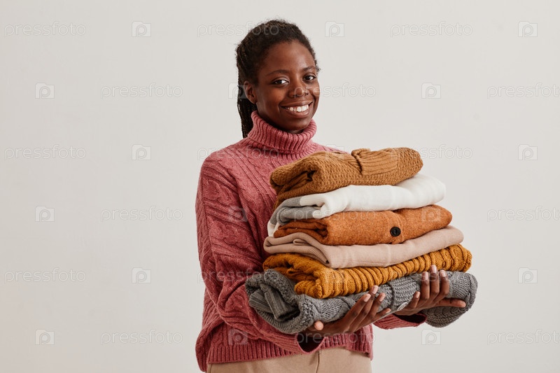 Улыбающаяся женщина держит свитер