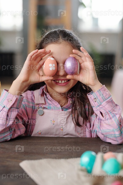 Веселая милая маленькая девочка в повседневной одежде, держащая окрашенные пасхальные яйца у глаз