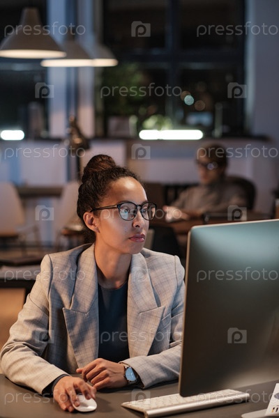 Серьезно ориентированный молодой менеджер компании смешанной расы в очках, используя современные компьютеры и разрабатывая стратегию проекта
