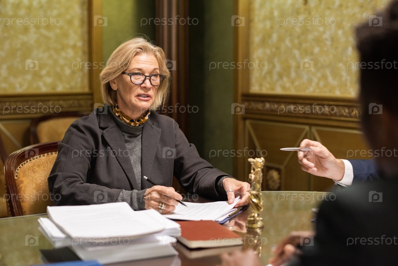 Уверенная в себе зрелая женщина-адвокат в очках, разговаривающая с молодой коллегой