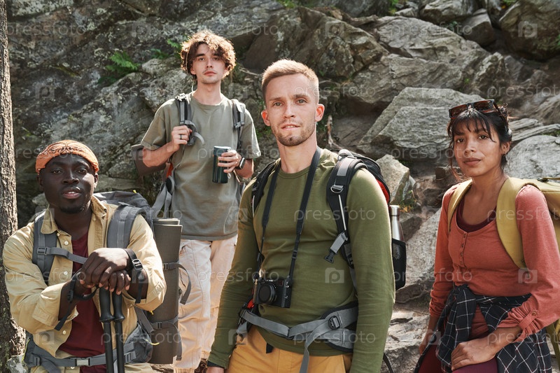 Группа уверенных молодых мультиэтнических туристов с сумками, стоящих на скалах и смотрящих в камеру