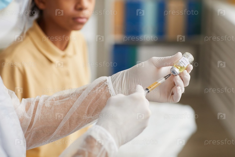 Доктор, удерживающий вакцину Шприц Closeup