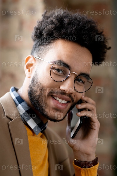 Портрет веселого чернокожего мужчины, использующего мобильный телефон