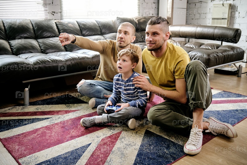 Милый мальчик и два парня смотрят телевизор