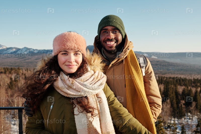 Счастливая молодая межкультурная пара, проводящая зимний день на улице