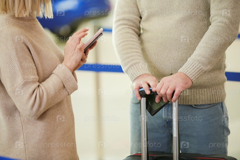 Зрелый мужчина-путешественник в повседневной одежде держит документы и чемодан, пока его жена использует смартфон