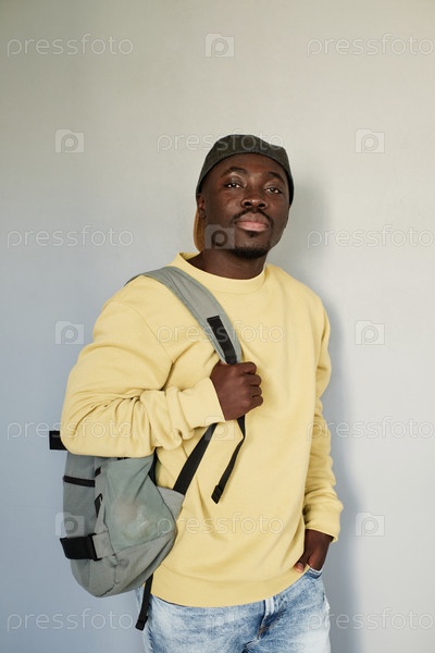 Портрет серьезного красивого чернокожего студента в желтой свитерке и шляпе, стоящего с сумкой на изолированном заднем плане