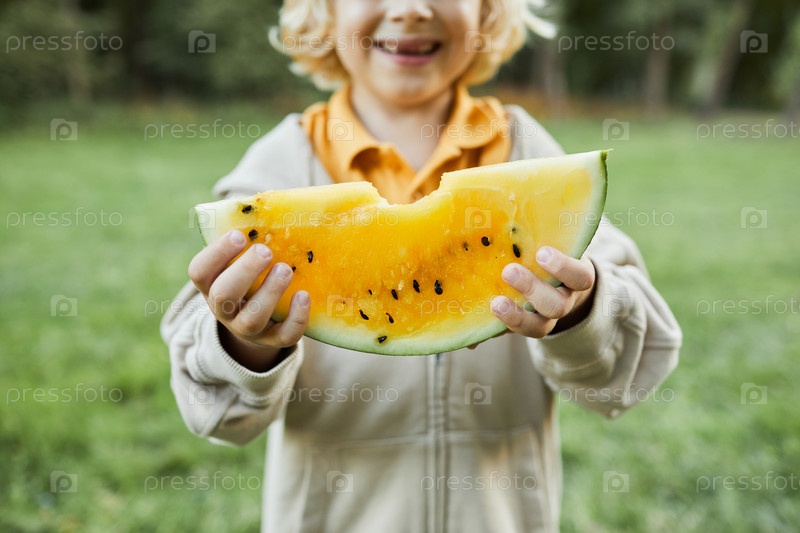 Улыбающийся мальчик ест арбуз вблизи