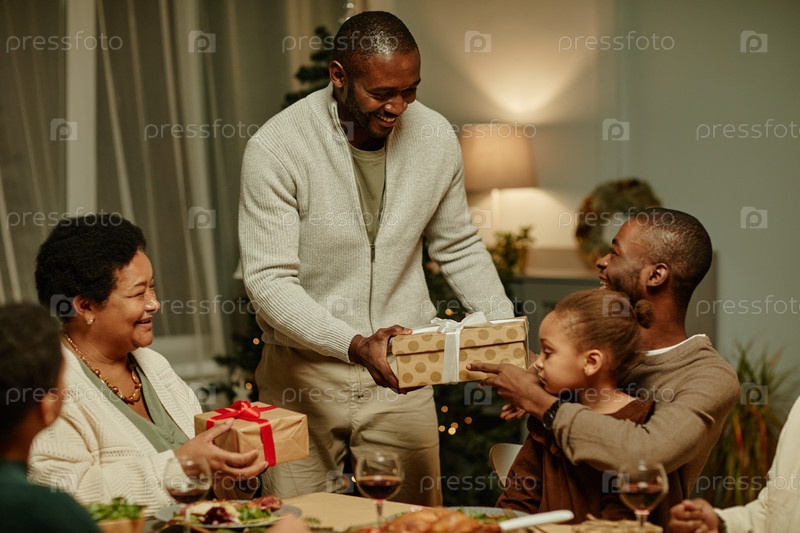 Афроамериканская семья обменивается рождественскими подарками