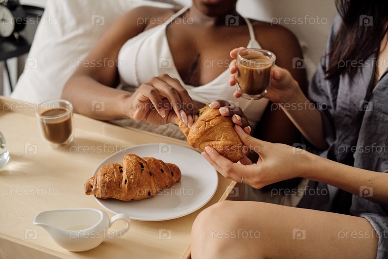 Две девочки делятся свежим кроасаном во время завтрака