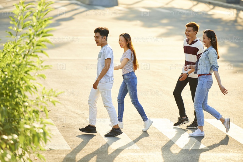 Взволнованные молодые пары пересекают дорогу