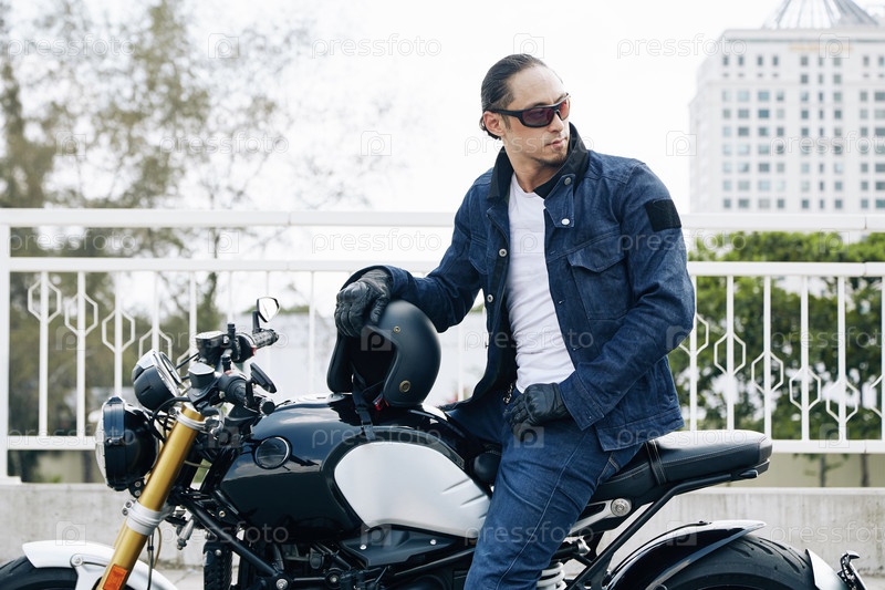 Стильный мужчина сидит на мотоцикле