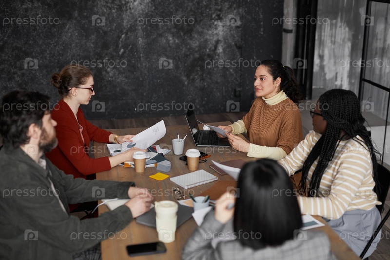 Разнообразная команда деловых людей встречается в черном офисе