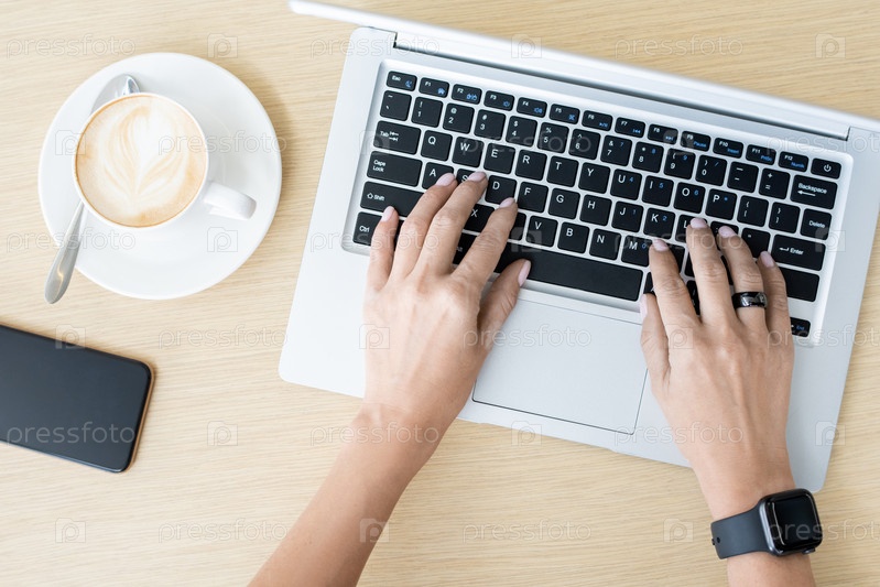 Руки женщины-фрилансера, сидящей за столом и касающейся кнопок клавиатуры ноутбука