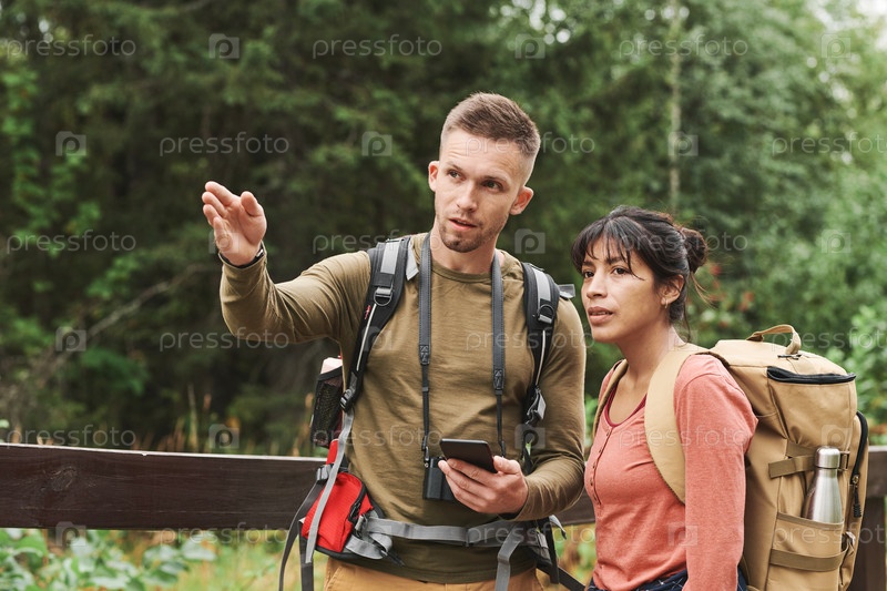 Молодой турист с камерой, висящей на шее, жестикулирует рукой и использует телефон во время объяснения маршрута женщине