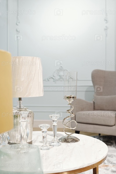 Часть интерьера современной студии дизайна с креслом, круглым столом, лампой
