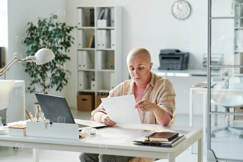 Серьезная молодая женщина-аналитик в непринужденном наряде сидит за столом с ноутбуком и читает деловую газету в офисе