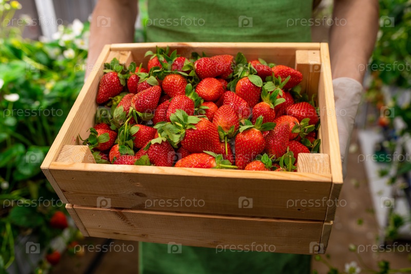 Перчаточные руки молодого мужского рабочего вертикальной фермы, держащего деревянную коробку с кучей спелых клубники