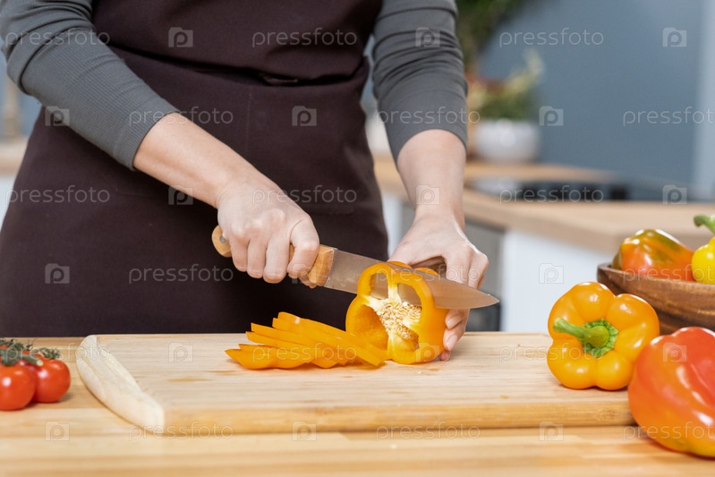 Руки молодой самки, нарезающей свежий желтый капсикум