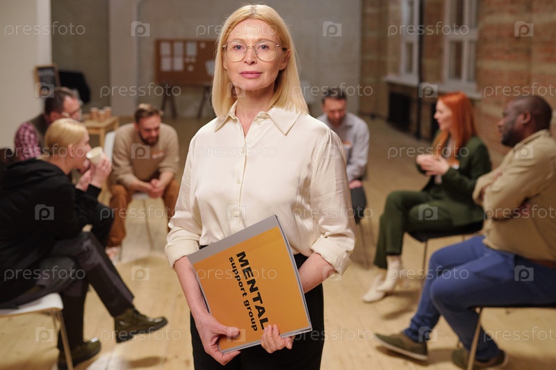 Уверенная зрелая женщина-консультант в очках, держащая журнал группы психической поддержки