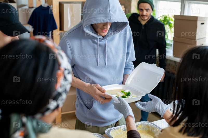 Женщина-волонтерка передает контейнер с бесплатной едой парню в синей толстовке