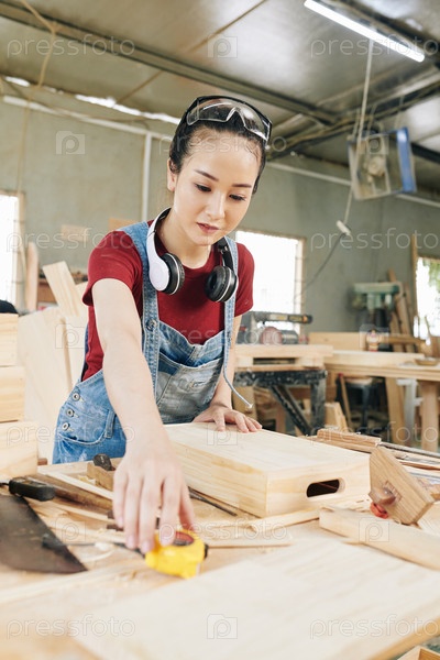Плотник, измеряющий деревянный ящик
