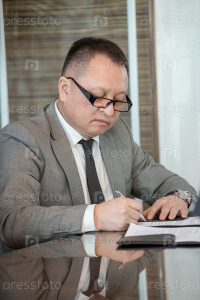 Серьезный зрелый делегат в элегантном костюме подписывает договор о деловом партнерстве