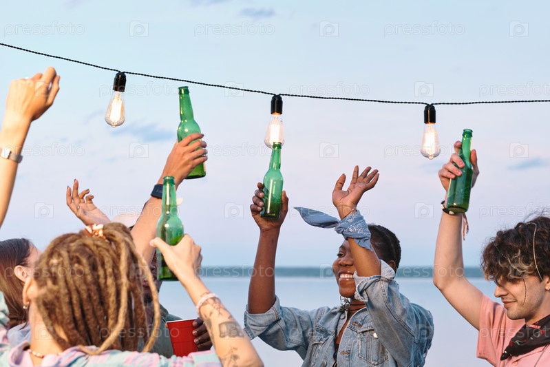 Молодые в восторге друзья с бутылками пива танцуют у воды