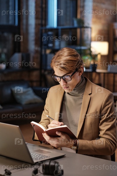 Концентрированный молодой менеджер делает заметки в дневнике и просматривает отчет, работая допоздна в офисе