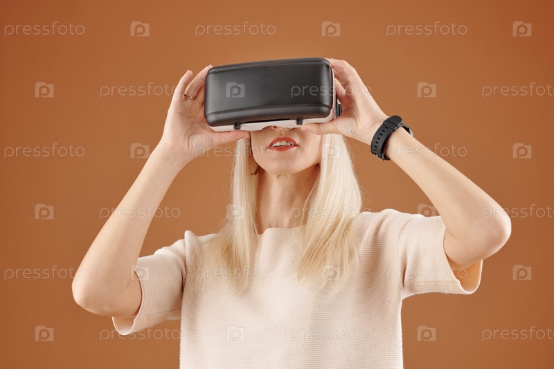 Взволнованная женщина смотрит видео в гарнитуре VR