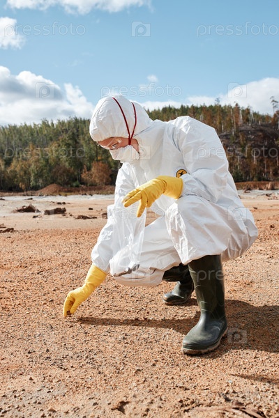 Эколог в костюме опасного материала приседает на земле и собирает образцы загрязненной почвы на территории с плохой экологической ситуацией
