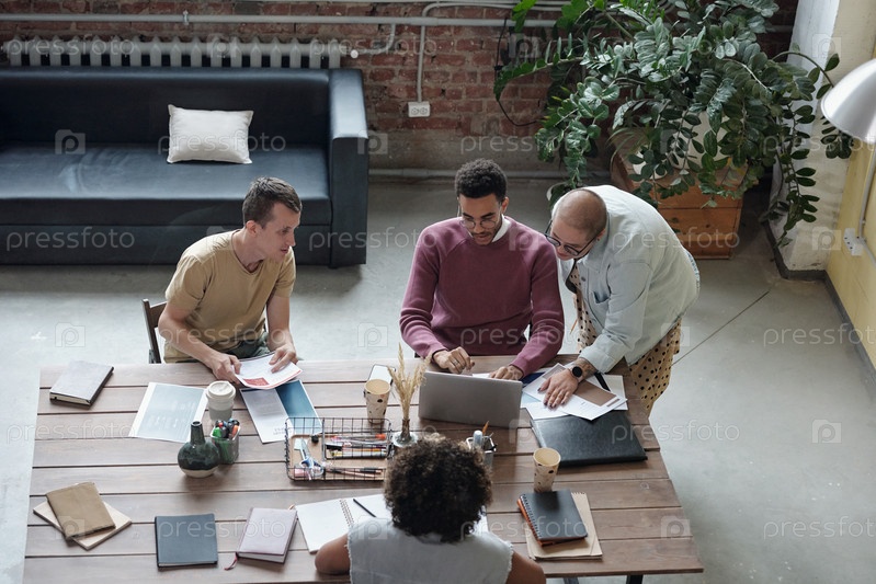 Молодые межкультурные коллеги собрались перед ноутбуком, обсуждая моменты нового проекта