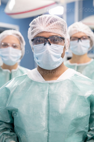 Молодой профессиональный хирург-мужчина и его два помощника в защитной рабочей одежде