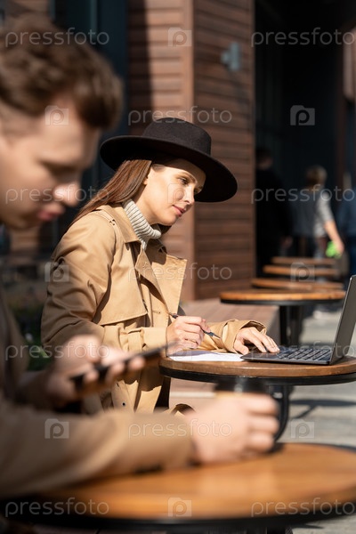 Современная молодая элегантная деловая женщина или студентка, работающая в сети на открытом воздухе