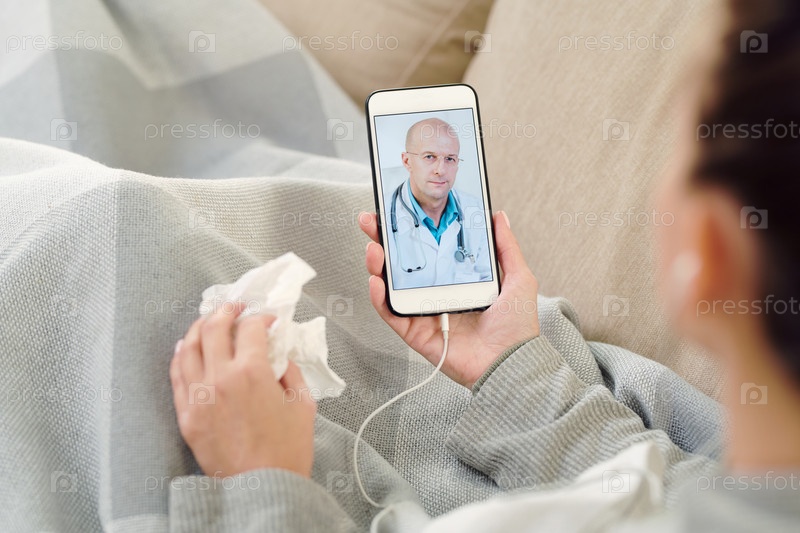 Молодая больная женщина держит смартфон с зрелым врачом на экране