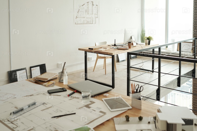 Два рабочих места архитекторов в большом современном открытом офисном пространстве